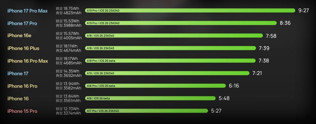 Chinese tech journalist Geekerwan conducted a similar test using the physical SIM tray iPhones, and found the jump from the previous generation to the 17 series to be even more dramatic. In their findings, the 17 Pro Max lasted almost two hours more than its predecessor. Even the base model iPhone 17 nearly matched the 16 Pro Max on longevity.