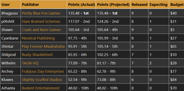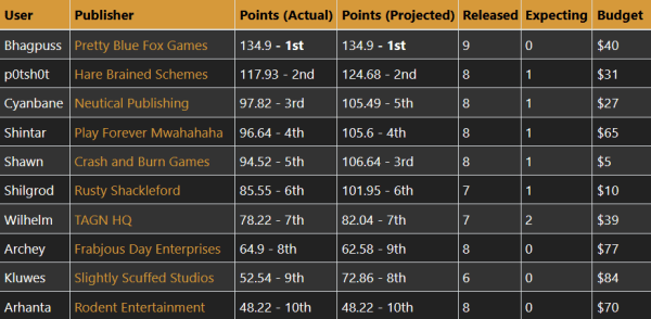 Nobody is yet locked in on the final position. Even Bhagpuss, at the top of the scoreboard, could face a challenger if the reviews favor Potshot. But first, where we ended up last week.