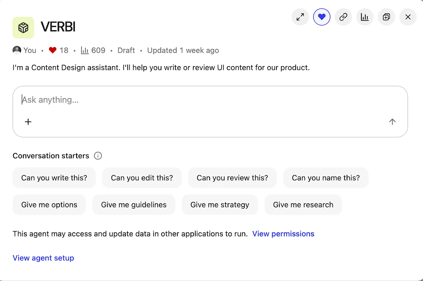 With my prompts and resources in place, VERBI was ready to launch. I tested the agent with distinct questions about our design system and style guide, along with real content scenarios to consider.