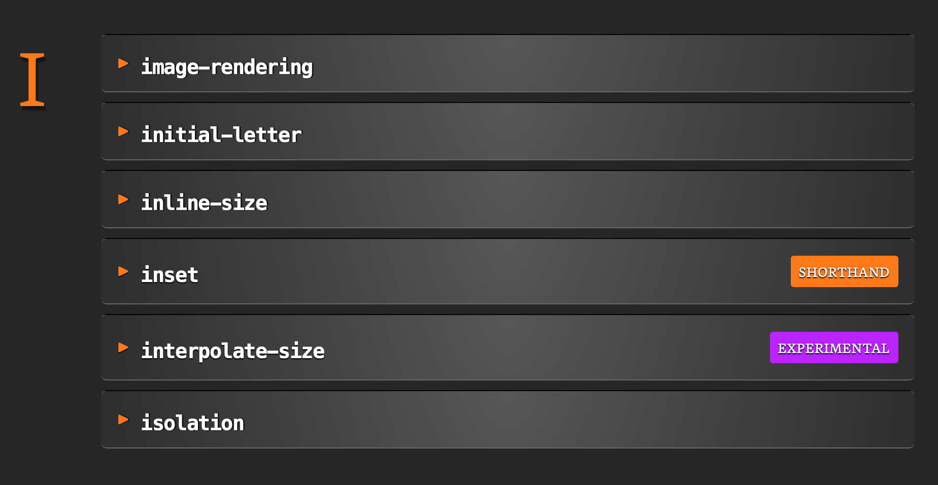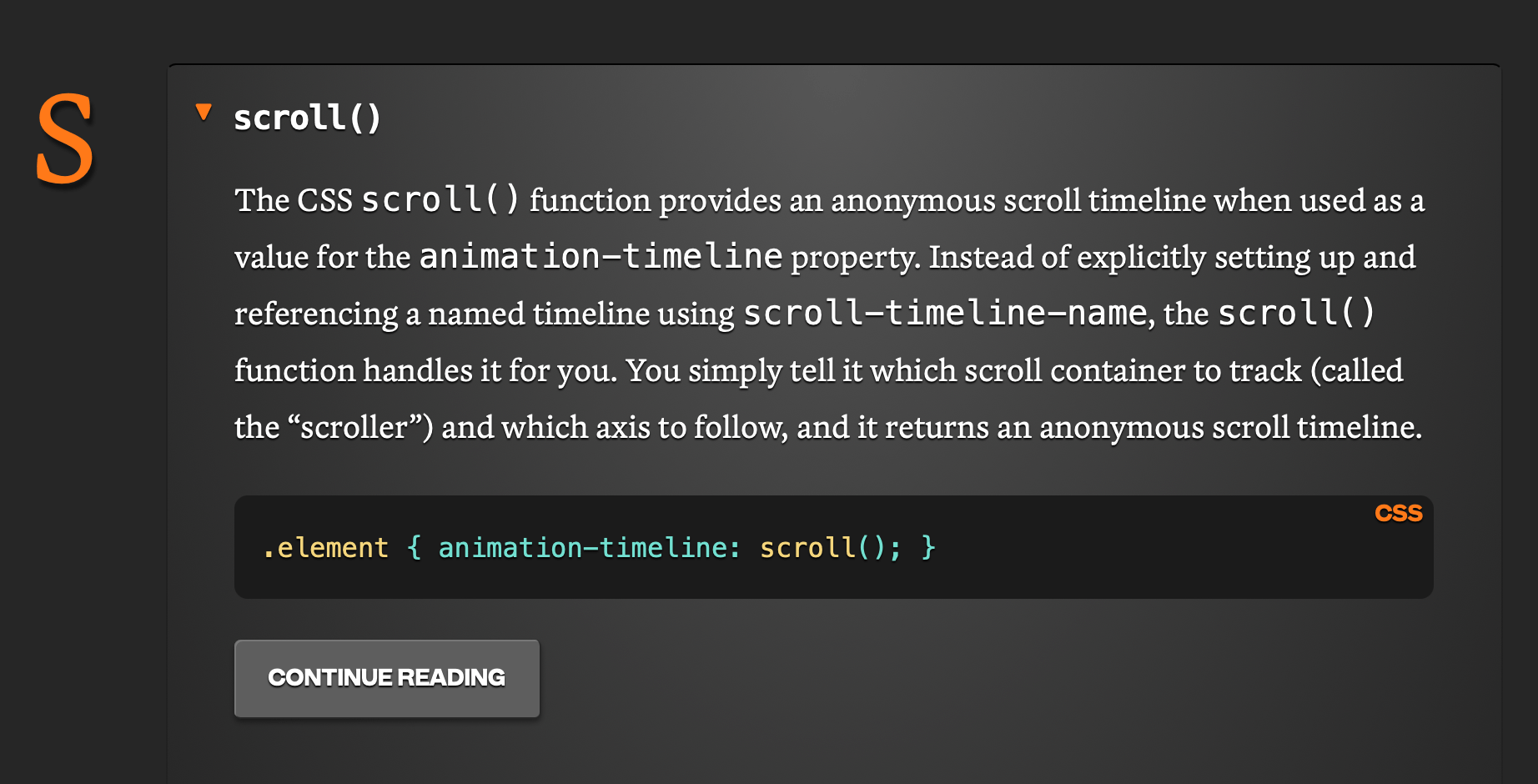 …because that’s the area we invested most of our time and energy. You may remember that the Almanac has historically been a spot to learn about CSS properties and pseudos. Last year, though, we stuffed the Almanac’s mouth with a fistful of steroids and gave it new sections so that we’re covering all the CSS features we possibly can, including functions, selectors, and at-rules.
